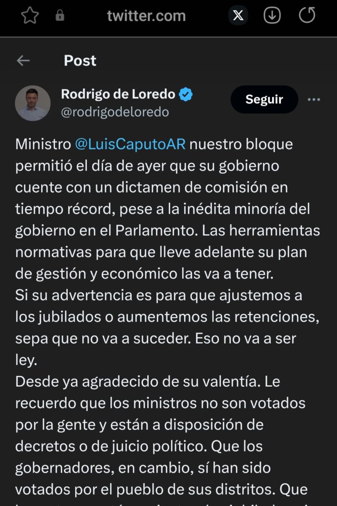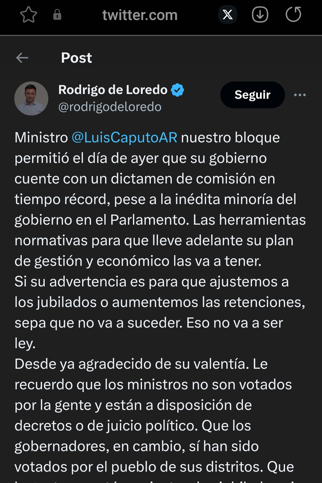 Desde ya agradecido de su valentía. Le recuerdo que los ministros no son votados por la gente y están a disposición de decretos o de juicio político. Que los gobernadores, en cambio, sí han sido votados por el pueblo de sus distritos. Que la gente no votó un ajuste a los jubilados ni un aumento de retenciones. Esto tampoco es una amenaza, es una respuesta a todos los jubilados y productores que se preguntan si el ajuste volverá a caer sobre ellos o si verdaderamente se produjo un cambio.