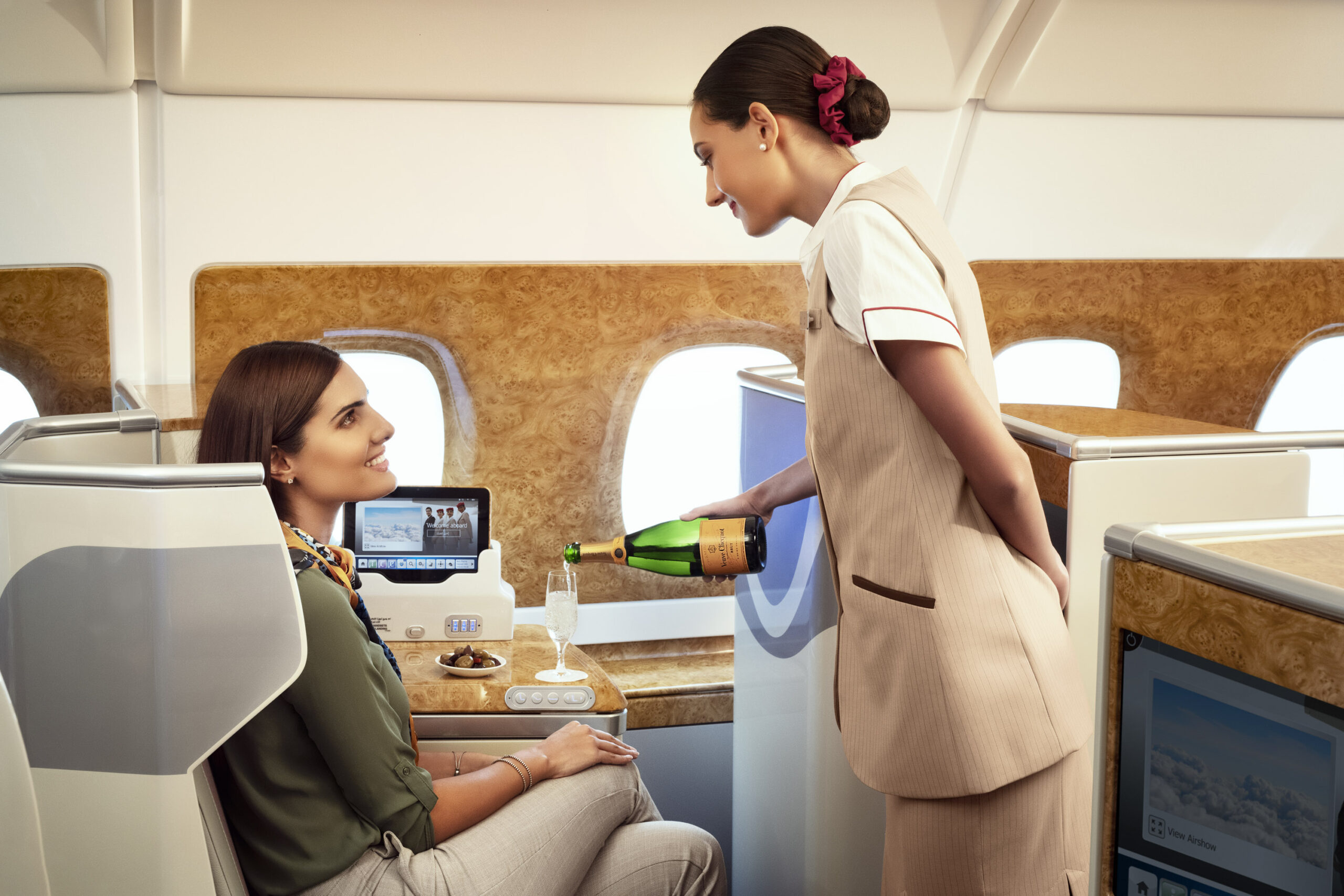 En Emirates, Dom Pérignon se sirve en First Class en todas las rutas mundiales, Veuve Clicquot se sirve en Business Class en las rutas a América, Reino Unido y Europa, y Moët & Chandon se sirve en Business Class en las rutas a África, Oriente Medio y Asia-Pacífico, incluida Australasia. Los pasajeros de Economy también pueden comprar Moët & Chandon a bordo.
