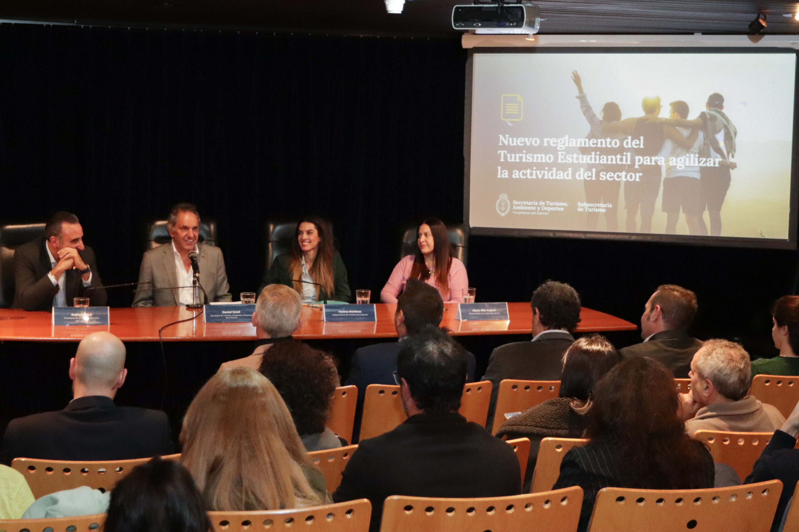 El secretario de Turismo, Ambiente y Deportes de la Nación, Daniel Sioli; junto a la subsecretaria de Turismo, Yanina Martinez; el presidente de la Cámara Argentina de Turismo, Gustavo Hani, y la responsable de Turismo Estudiantil, María Rita Kuiyan, dieron a conocer los cambios implementados en el nuevo reglamento de turismo estudiantil. Durante el acto, también participaron el intendente de Villa Carlos Paz, Esteban Aviles; el presidente de Cámara Argentina de Turismo Estudiantil (CATE), Gaston Burlón, y presidente de la Cámara Federal de Turismo, Sandro Meirás.