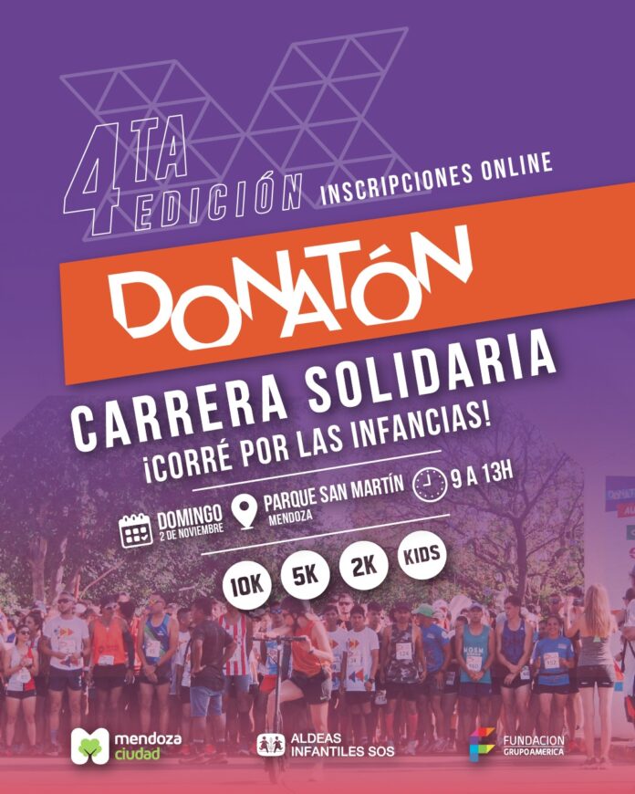 Aldeas Infantiles SOS Argentina, Fundación Grupo América y la Municipalidad de la Ciudad de Mendoza invitan a toda la comunidad a participar de una nueva edición de Donatón, una maratón solidaria que se realizará el domingo 2 de noviembre a partir de las 9 horas en el Parque General San Martín de la Ciudad de Mendoza. La carrera contará con recorridos de 10K y 5K, además de una instancia participativa de 2K y un circuito especial para niños y niñas.