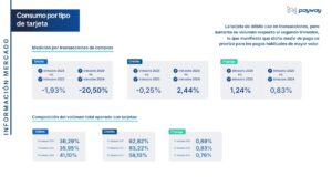 Del análisis del consumo por tipo de tarjeta, se destaca que la tarjeta de débito cae en transacciones, pero aumenta su volumen respecto al segundo trimestre, lo que manifiesta que dicho medio de pago se prioriza para los pagos habituales de mayor valor.
