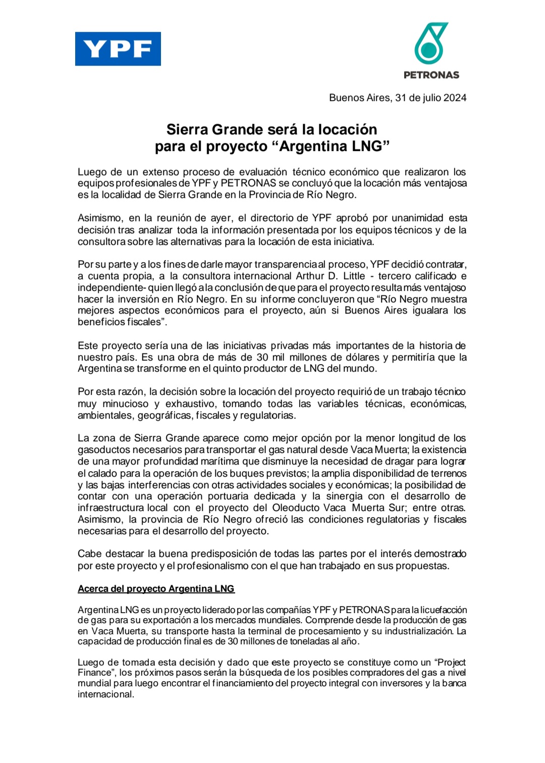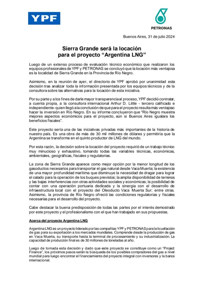 Luego de un extenso proceso de evaluación técnico económico que realizaron los equipos profesionales de YPF y PETRONAS se concluyó que la locación más ventajosa es la localidad de Sierra Grande en la Provincia de Río Negro.