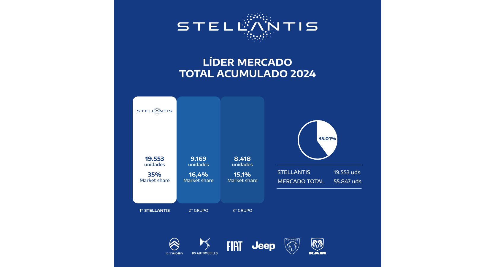 Stellantis es la house of brands que lidera el mercado automotor argentino gracias a la fuerte aceptación que el público argentino siente por las icónicas marcas Citroën, DS Automobiles, Fiat, Jeep, Peugeot y Ram. A las destacadas performance comercial de Fiat con 8.488 unidades vendidas, Peugeot con 6.064, Jeep con 2.410 y Citroën con 2.121; se suma el destacado lanzamiento de la nueva pickup Ram Rampage. Por su parte, DS Automobiles se consolida en el exclusivo mercado premium.