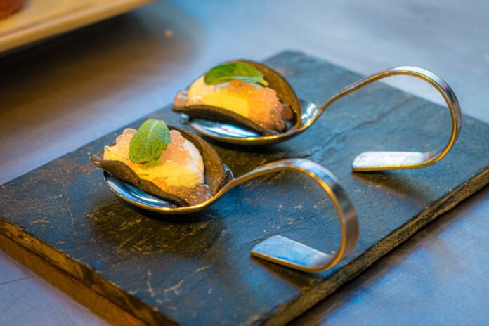 • Entrada: Esferificación de yogur natural, queso Pecorino, menta y albahaca con crocante de carbón activado y falso caviar de tomates.