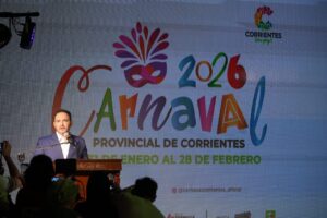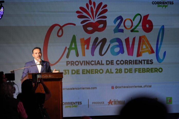 El gobernador Juan Pablo Valdés encabezó este viernes el lanzamiento oficial de la edición 2026 del Carnaval de Corrientes, que se desarrollará del 31 de enero al 28 de febrero. De esta manera, en un acto que se realizó en el predio de La Unidad, a la cual también asistieron comparseros, otras autoridades provinciales y municipales, y representantes de “De la Estrella” producciones, empresa organizadora junto al Gobierno provincial, el primer Mandatario se comprometió a continuar con las obras en el Corsódromo “Nolo Alías” e invitó a disfrutar de Corrientes de enero a febrero con “el chamamé y el carnaval”.