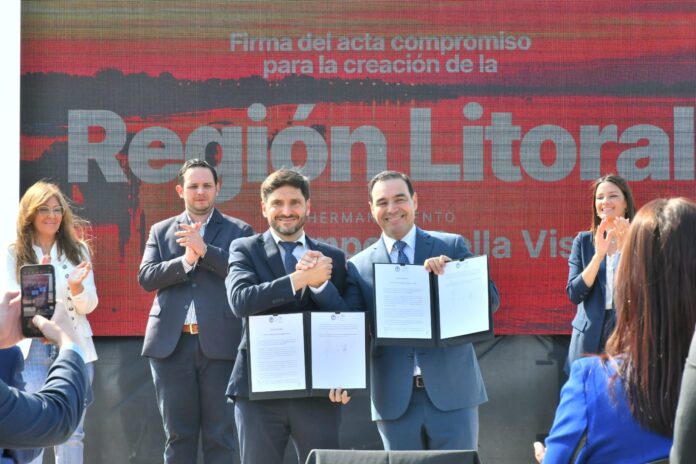 El gobernador Gustavo Valdés firmó este jueves junto a su par de Santa Fe, Maximiliano Pullaro un acta de compromiso para la creación de la Región Litoral, iniciativa que permitirá concretar políticas públicas sobre los intereses comunes de ambas provincias. Durante el acto, realizado en la localidad santafesina de Villa Ocampo, también se firmó un acta de hermanamiento entre esta ciudad y la correntina Bella Vista.