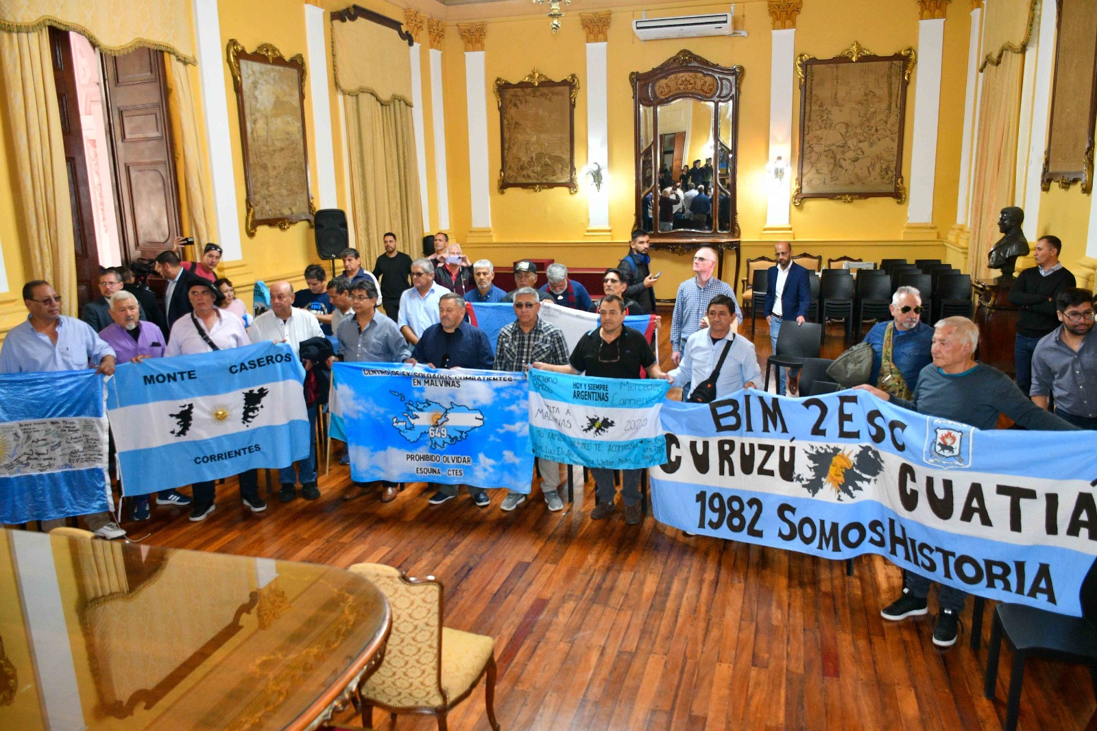 El gobernador Gustavo Valdés, junto al ministro de Seguridad, Alfredo Vallejos, recibió esta mañana en el Salón Amarillo al contingente de 20 excombatientes correntinos que retornaron de las Islas Malvinas, luego de un viaje como ellos mismos lo catalogaron de “sanador”, siendo el quinto de este tipo que es organizado y financiado por la Provincia, reivindicando la causa Malvinas como política de Estado.
