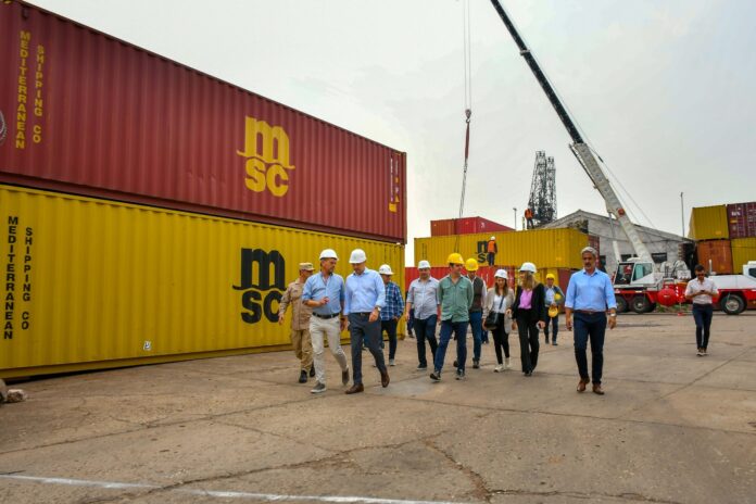 Acompañaron en esta recorrida al gobernador la ministra de Industria, Mariel Gabur y el director de Transporte Fluvial y Puertos, Adolfo Escobar Damus; en representación de MSC, Alonso Sopeña Guillén, Pablo López y Romina Moreno, gerente general, gerente de logística y directora comercial, respectivamente.